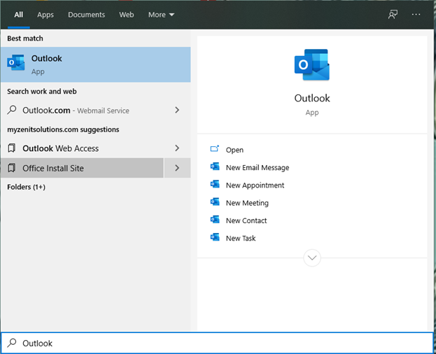 Step 1) Go to the Start Menu and type “Outlook” and click to open Outlook
